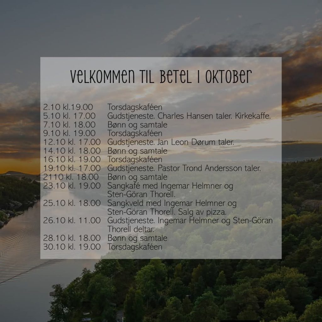 Kristi menighet Betel, Tro BETEL, HALDEN – aktiviteter oktober 2025 01/10/2025 Dette skjer i min kirke nå i oktober. Alle er velkomne. Forrige Er kristen tro en privatsak man skal holde for seg selv sett i bibelsk perspektiv? Du vil kanskje også like Dagens tørre. 28/03/2022 Artikkel: Tidligere fredsprisvinner Desmond Tutu er død 26/12/2021 Ny Gig Bag 16/02/2022 Legg igjen en kommentar Avbryt svarDin e-postadresse vil ikke bli publisert. Obligatoriske felt er merket med *Navn * E-post * Nettsted Kommentar Δ This site uses Akismet to reduce spam. Learn how your comment data is processed.