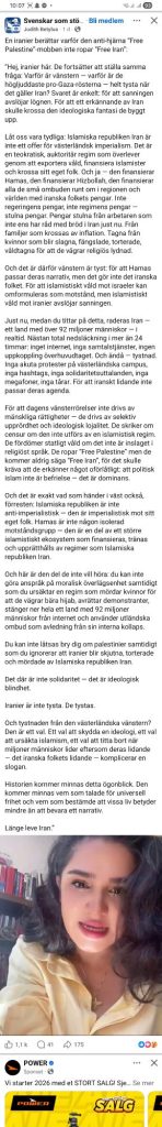 Fordi dagens venstrebevegelser ikke drives av menneskerettigheter – de drives av selektiv indignasjon og ideologisk lojalitet. De skriker om sensur når den ikke utføres av et islamistisk regime. De fordømmer statlig vold når den ikke er pakket inn i religiøst språk. De roper «Free Palestine», men de vil aldri si «Free Iran», for det ville kreve at de erkjenner noe utilgivelig: at politisk islam ikke er frigjøring – det er dominans.