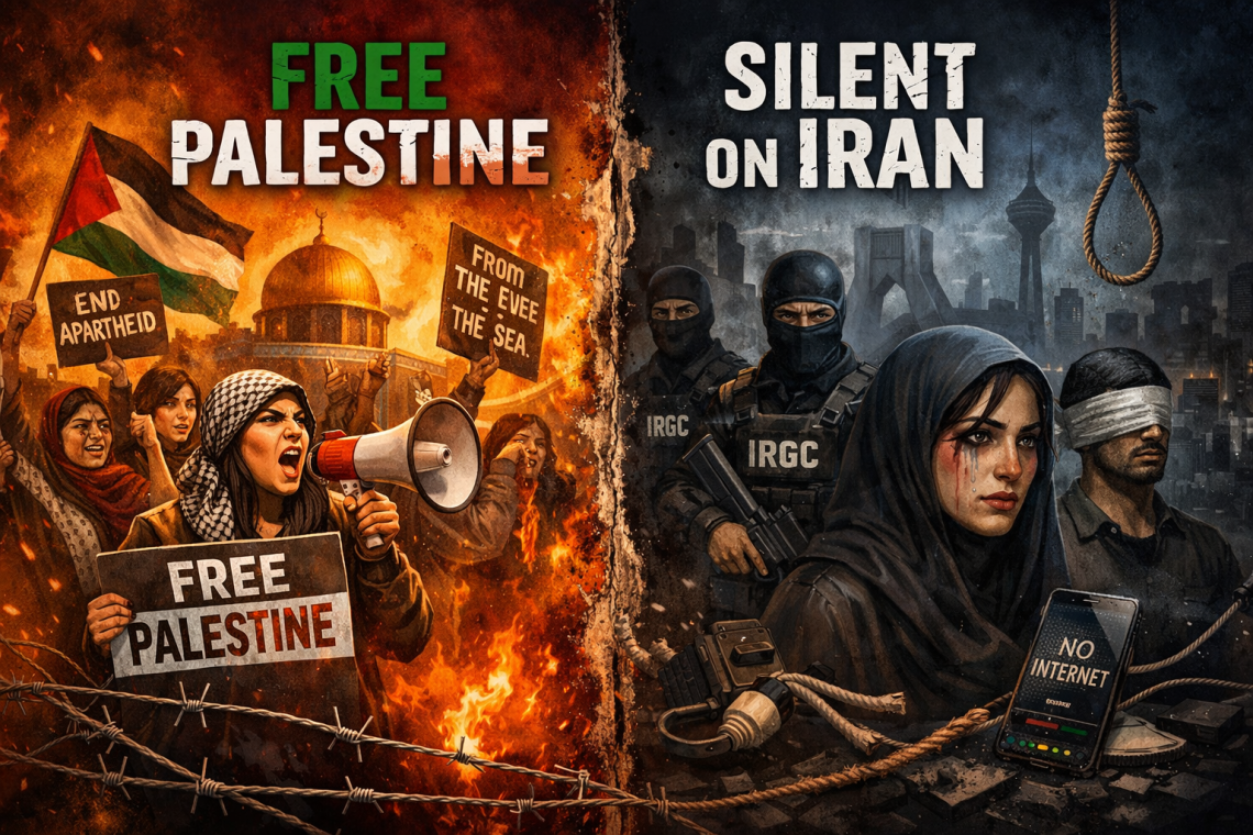 Fordi dagens venstrebevegelser ikke drives av menneskerettigheter – de drives av selektiv indignasjon og ideologisk lojalitet. De skriker om sensur når den ikke utføres av et islamistisk regime. De fordømmer statlig vold når den ikke er pakket inn i religiøst språk. De roper «Free Palestine», men de vil aldri si «Free Iran», for det ville kreve at de erkjenner noe utilgivelig: at politisk islam ikke er frigjøring – det er dominans.
