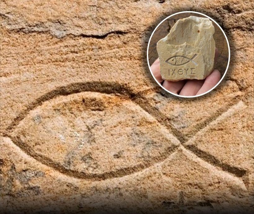 Symbolet på bildet er Ichthys-fisken, også kalt Kristusfisken.